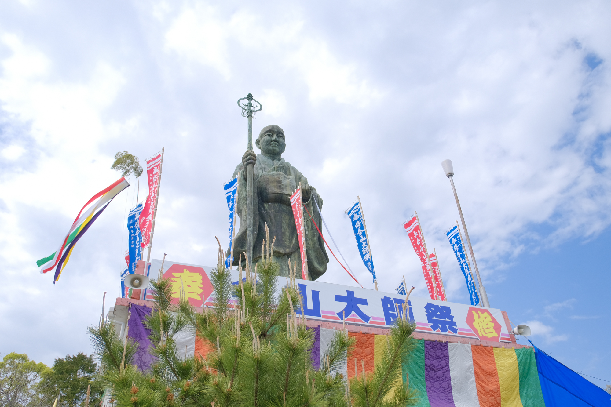 弘法大師像は、 延岡駅から歩いて約15分、今山大師寺の頂上にあります。1839年(天保10年)延岡の地で疾病が猛威を振るった際、延岡城下の大師信徒たちが高野山金剛峰寺(こんごうぶじ)まで行き、弘法大師座像(現在の本尊)を勧請(かんじょう)して「家内安全」「息災延命」「五穀豊穣」「商工発展」の祈願のために大師庵を経てたことが縁起となっています。大正7年に大師堂が建立され、さらに昭和32年、信者や近郷近在の有志から広く浄財が寄せられ、高さ17メートル、日本一の弘法大師像が建立されました。