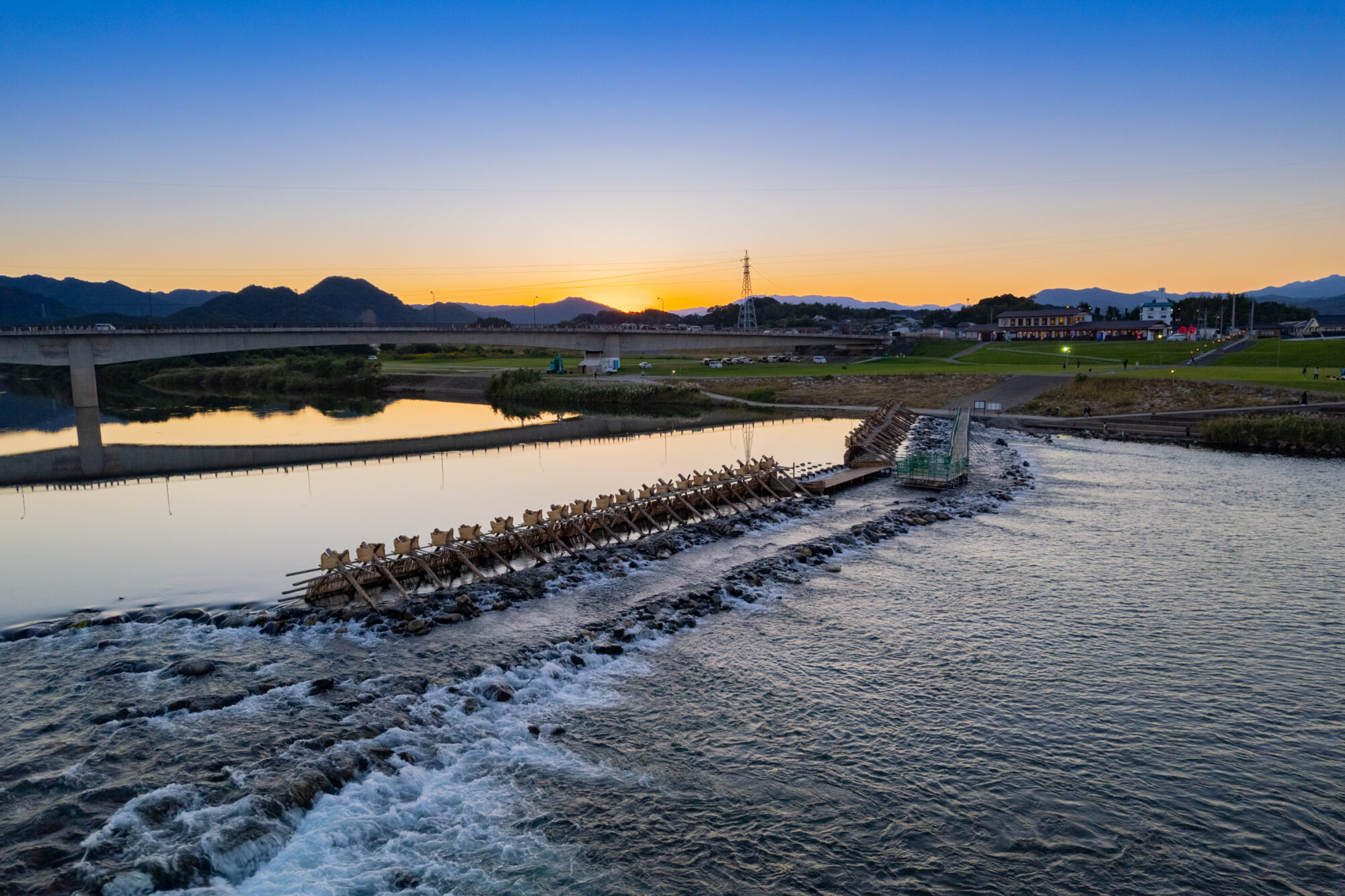 やな漁は全国的に見られる漁法ですが、中でも川幅が100mを超える場所、さらに市街地の近くに架設される「水郷延岡鮎やな」は非常に珍しく、他には類をみない壮大なスケールを誇ります。