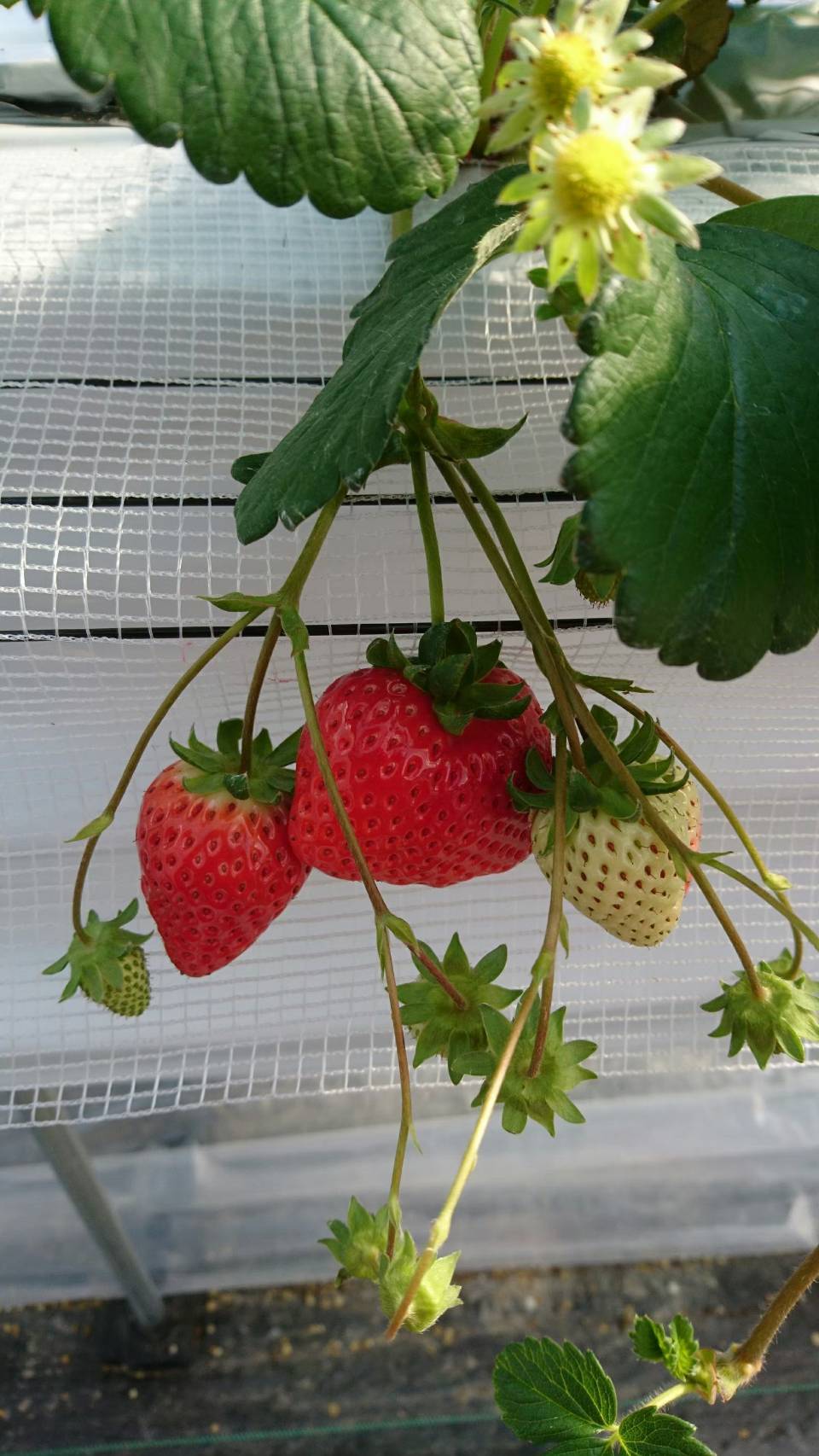 広々した6棟のハウスで通路幅もゆったりしており、ベビーカーも利用できます。4品種(さがほのか、紅ほっぺ、とちおとめ、おいCベリー)のいちごの食べ比べを楽しめます。人気の品種は早い者勝ち!