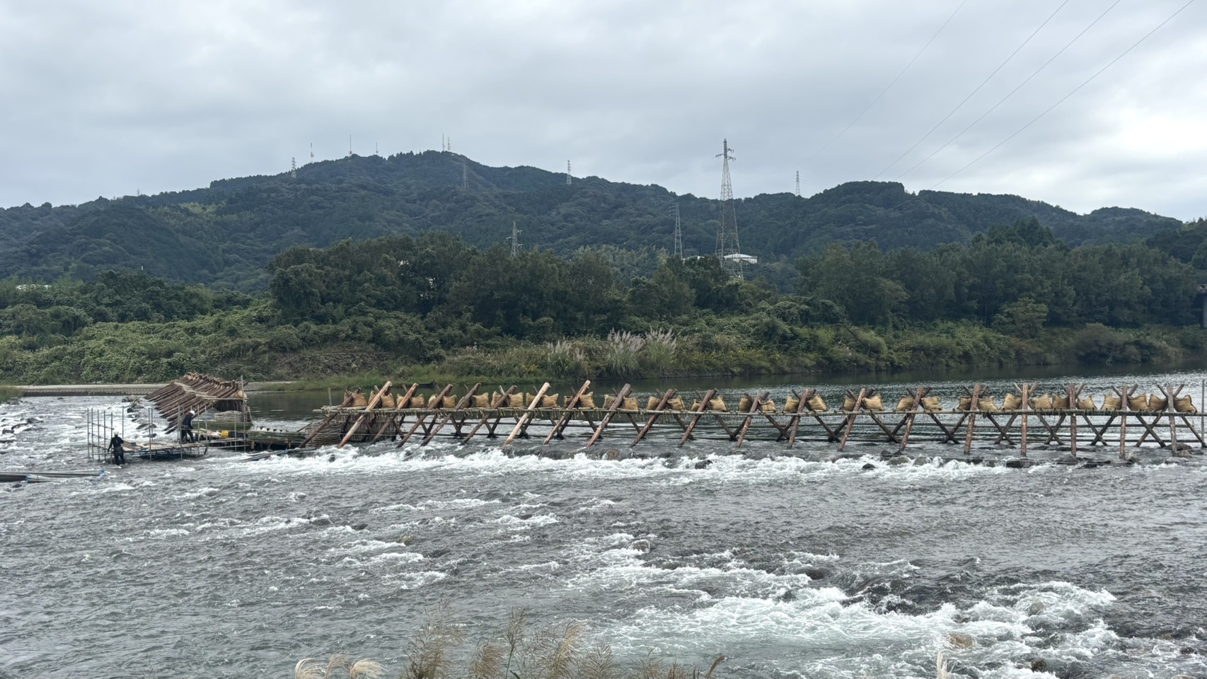 TOP>>鮎やな架設状況③ 2025.10.23 鮎やな架設状況③ 2025.10.23 鮎やな架設状況・第3弾!! 鮎が落ちる仕組みとなる「落テ簀(おてす)」の組立が進んでいます! 竹でできたスノコ状の部分で、ここに落ちた鮎を採る伝統的な仕掛けです。 完成に向けて、鮎やなが少しずつ姿を現してきました✨ 今後も進捗をお楽しみに! 関連情報ばんば踊り日本料理・御膳処 翠光オオスリバチサンゴ