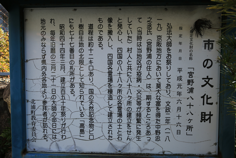 江戸時代後期、宮野浦地区で疫病や火災が頻繁に起こったことから、当時の交易で富を得た宮野浦の中野忠之丞の発願で四国霊場八十八ヶ所を勧請されました。文政 2(1819)年に、四国八十八ヶ所の、土と延岡で刻んだ石仏を船で搬入したのが由来と伝えられています。