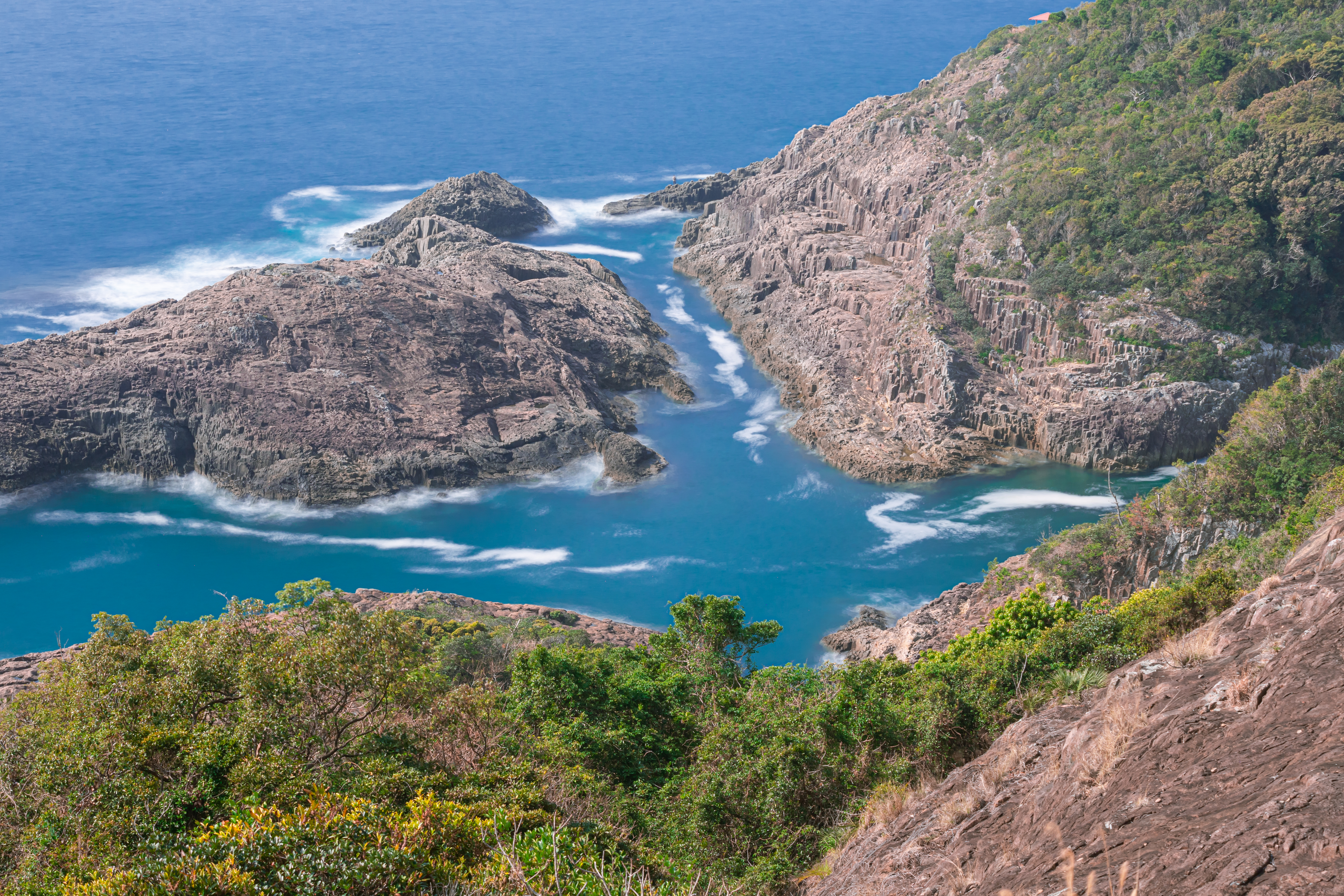 巨大な岩礁が波の侵食により東西約200m、南北約220mにわたって裂け、上からの見ると十文字(クルス)の形をしています。