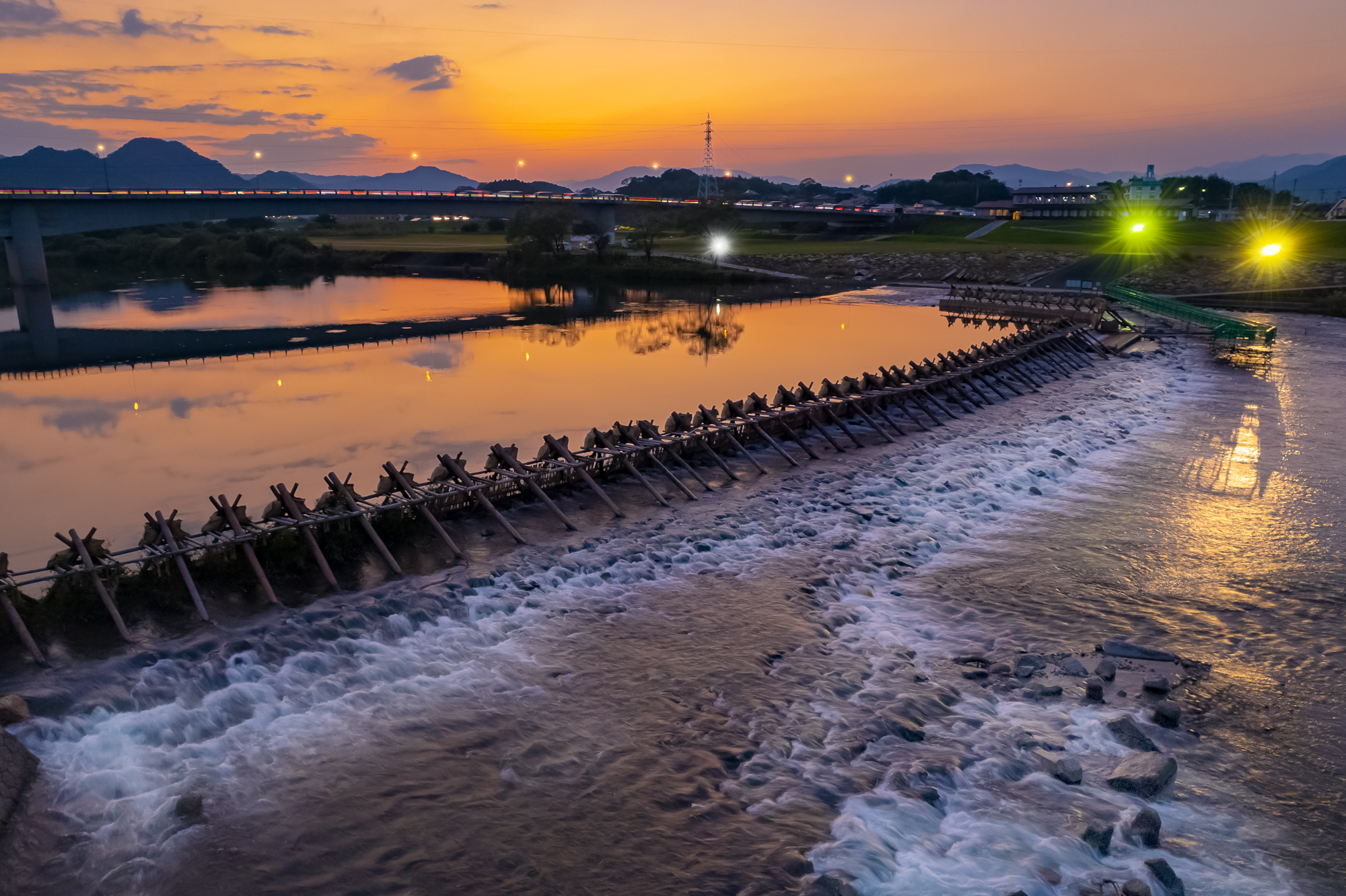 やな漁は全国的に見られる漁法ですが、中でも川幅が100mを超える場所、さらに市街地の近くに架設される「水郷延岡鮎やな」は非常に珍しく、他には類をみない壮大なスケールを誇ります。