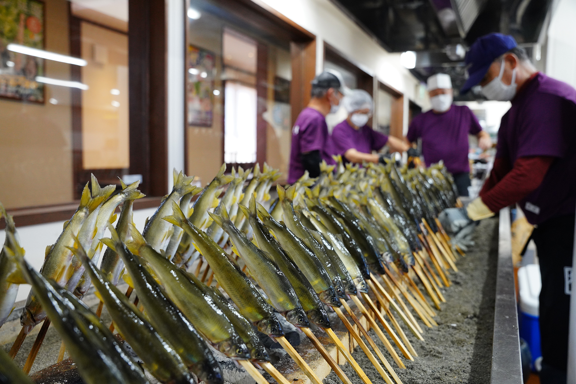 「延岡は鮎の宝庫」と称されるほど、延岡の鮎は有名です。延岡の市街地を悠然と流れる一級河川の五ヶ瀬川は、水が清らかで、鮎の餌となるコケが豊富にあるため、「尺鮎」と呼ばれる体長30cmを超えるような巨鮎が多数生息しており、過去には、体長36.5cm、体重600gという驚愕的なサイズの鮎が発見されたこともあります。