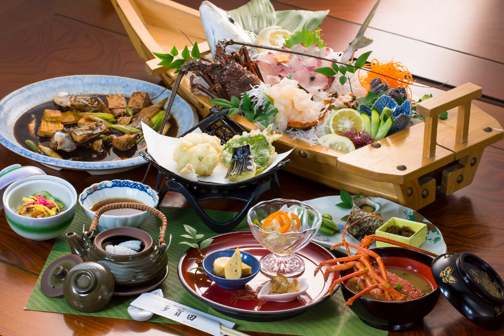調理人自ら目利きして入札し、買い付けた日向灘どれの魚介類と、地元の新鮮な野菜を使って作りだすこだわりの料理の数々は、地元はもとより県外からも多くの食通が訪れる延岡の名店。すっぽん鍋のほか宮崎牛しゃぶしゃぶ鍋、猪鍋(いずれも要予約)があり、特にすっぽん鍋は若い女性に人気です。「旬の魚をより新鮮に味わってもらうために」と設置した大小10個ものいけすは圧巻で、それを横目に楽しめるカウンターの他、小部屋、大部屋といろいろなシーンに対応できます。
